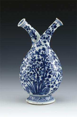 在這次展覽中,還有一個造型很顯眼的雙管瓶,或者也叫它油醋瓶,它有兩個口,中間是不通的,可以裝兩種液體調味品,這就是典型的定燒器。我們看到展品中的香薰形狀很高挑,跟我們的傳統(tǒng)式樣也不一樣。展出的景德鎮(zhèn)窯青花如意花卉紋香薰,是康熙貿易瓷中不多見的精品。